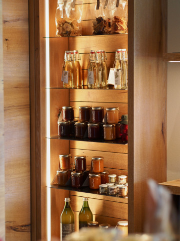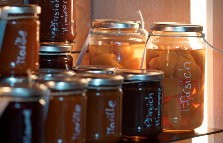 Die hofeigenen Produkte verarbeiten wir mit Liebe zu naturbelassenem Fruchtaufstrich, Mus, Kompott, Saft und Sirup. Die verschiedensten Obstsorten finden Sie als Trockenfrüchte und unsere Kräuter und Blüten mischen wir zu aromatischen und bunten Salzen. Wir bieten Ihnen gerne diese Produkte und frisches Obst und Gemüse zum Verkosten oder Kaufen in unserer Produktecke an. Sie können diese jedoch auch bei einem gewünschten Frühstück genießen.