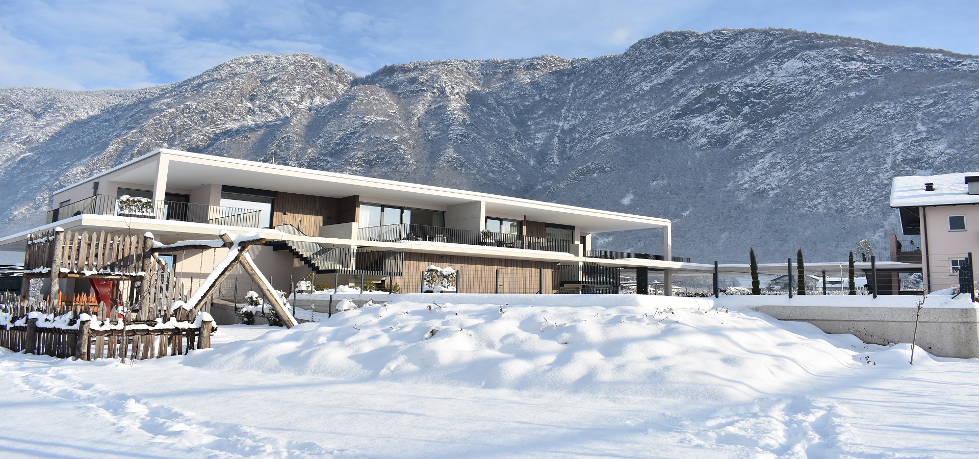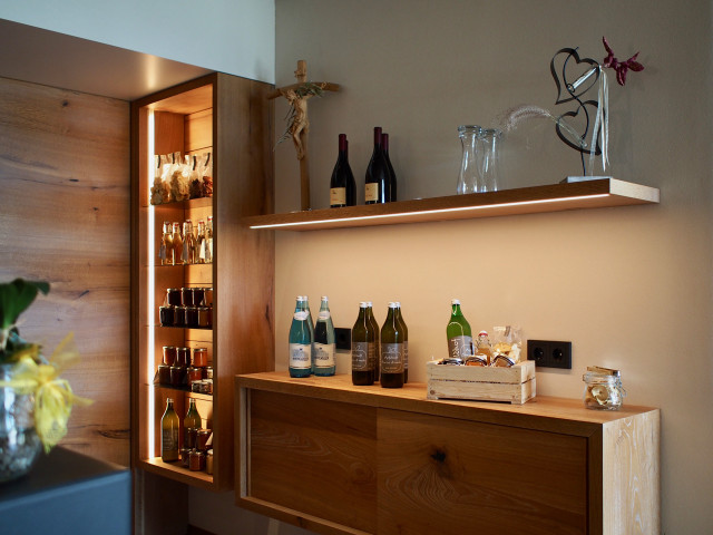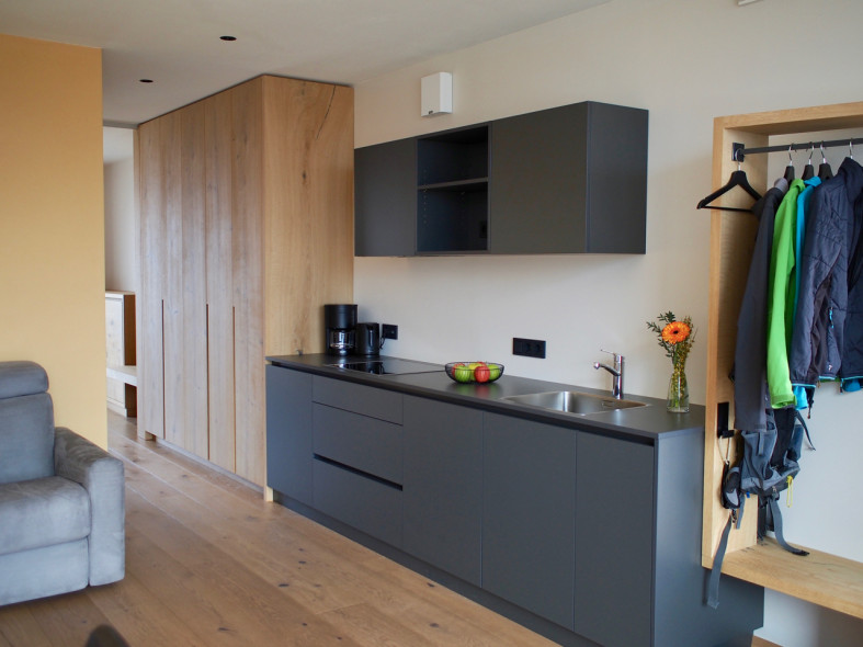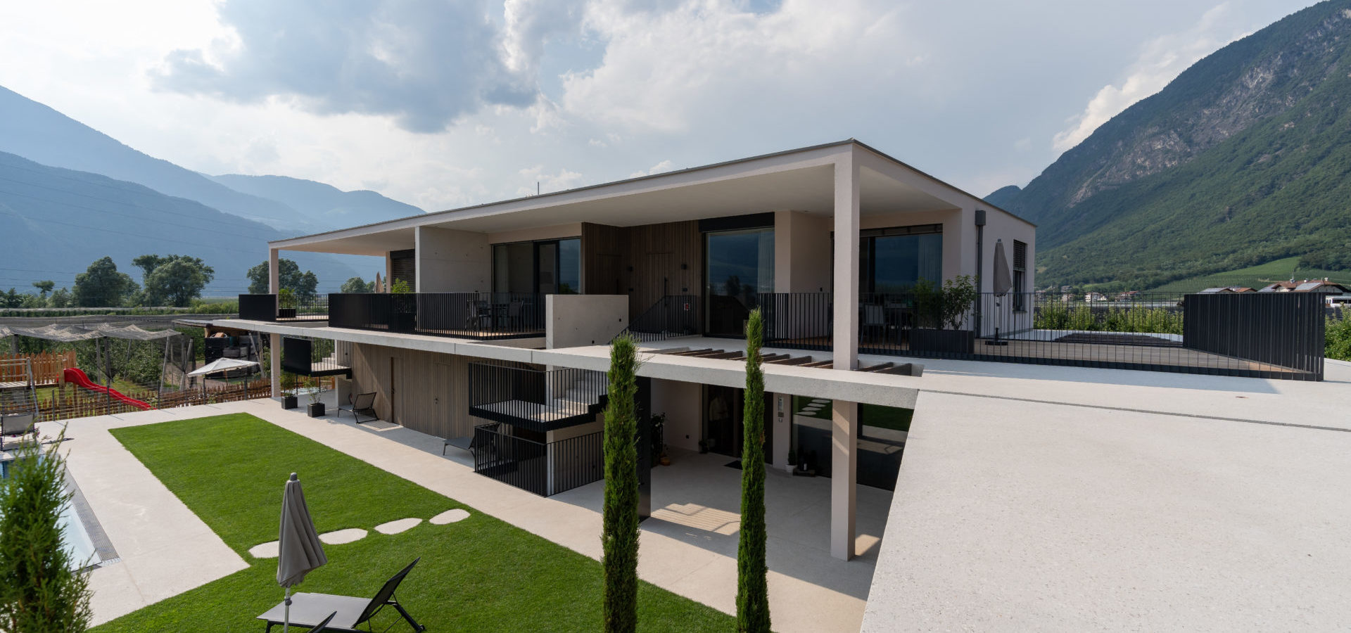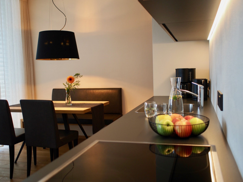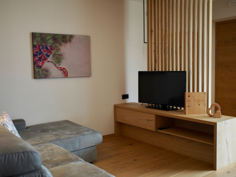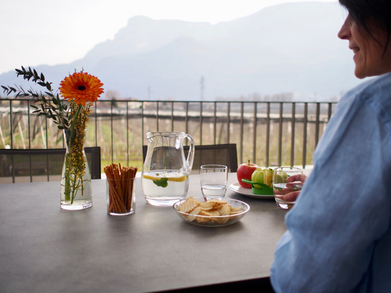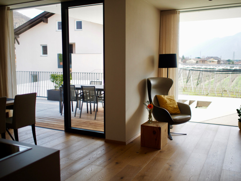 Unsere sonnendurchfluteten Ferienwohnungen für 2-7 Personen bestechen durch ihre moderne Geradlinigkeit und ihre Ausstattung mit warmen und regionalen Naturmaterialien. Die Großzügigkeit der Wohnungen und Terrassen garantieren Freiraum für Jedermann. Das Barfußlaufen über Massivholzböden und der gesundheitsfördernde Duft von Zirbelholz stehen für Erlebnis und Energie. Alle Ferienwohnungen sind nach Süden ausgerichtet und die großzügigen Panoramafenster bieten einen herrlichen Blick auf das breite Etschtal und die umliegende Bergwelt. Die Regulierung der Raumtemperatur über die Fußbodenheizung bzw. -kühlung erlaubt optimale Erholung, auch an sehr warmen Sommertagen.