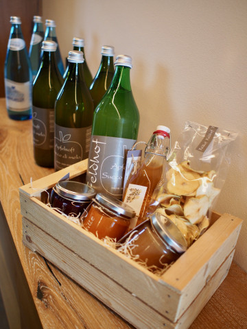 Lassen Sie sich verwöhnen und genießen Sie unsere hofeigenen oder selbst zubereiteten Produkte wie Fruchtaufstrich, Apfelsaft, Pfirsich- oder Birnennektar, Holunderblüten- oder Zitronenmelisse-Sirup, Obst nach Jahreszeit, getrocknetes Obst, Kompott, Apfelmus und hausgemachten Strudel, Kuchen oder Hefegebäck.